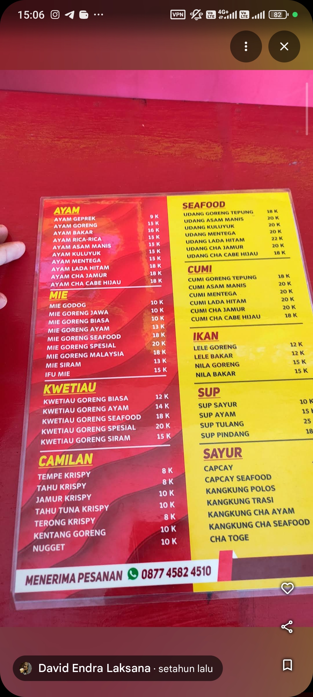 Pilih menu yang Anda suka, masukkan ke keranjang, lalu klik "Pesan via WhatsApp". Anda akan terhubung langsung dengan pemilik resto.